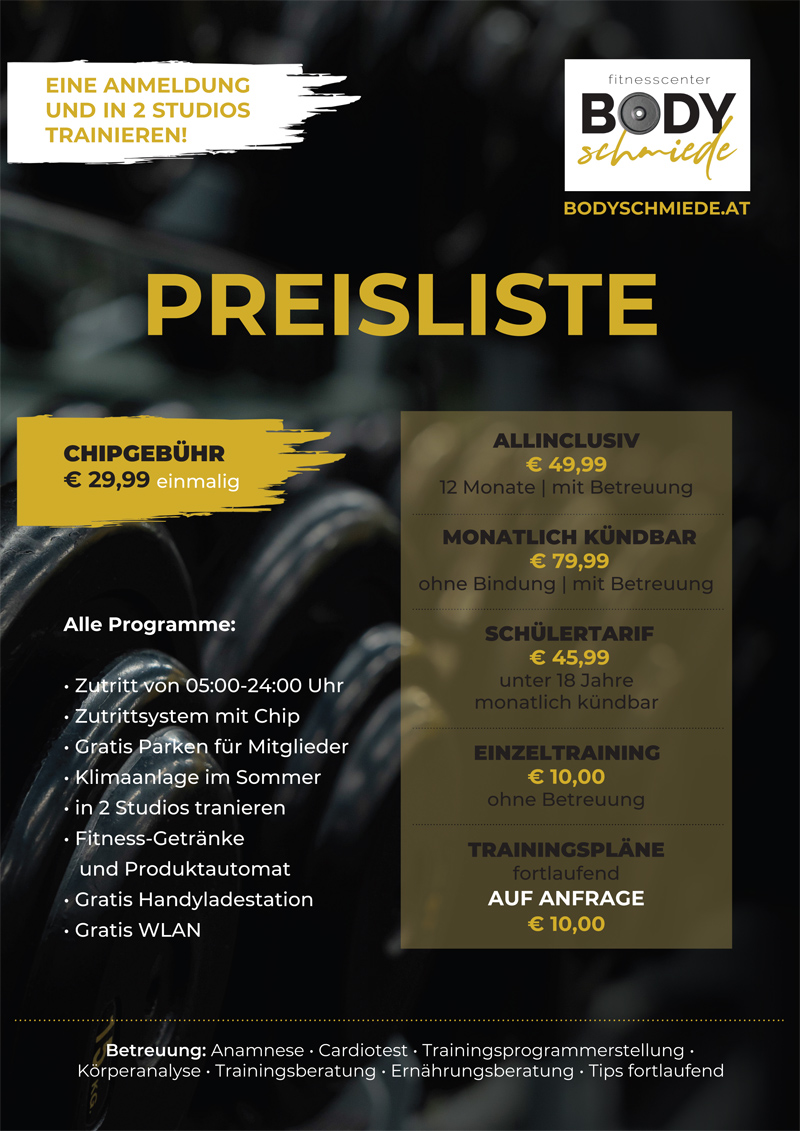 Betreutes Training von Montag bis Freitag von 9 - 12.30 Uhr und 17 - 21.00 UhrAnamese - Cardiotest - Trainingsprogrammerstellung fortlaufend - Körperanalyse - Trainingsberatung - Ernährungsberatung - Tipps fortlaufend!